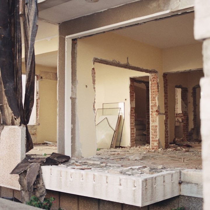 Entfernung von Wand- und Deckenverkleidungen, Fenstern und Türen, Rohrleitungen und Haustechnik.